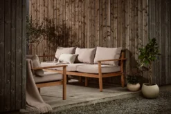Ruotsalaisen 1898-tuotemerkin 3-istuttava Stockyard teak -sohva on elegantti ja ajaton puutarhasohva, jossa on miellyttävät pehmusteet ja tilaa jopa kolmelle henkilölle. Pehmusteet on valmistettu nopeasti kuivuvasta vaahtomuovitäytteestä sekä vettä hylkivästä ja UV-kestävästä olefiinista. Käsittelemätön tiikki ei tarvitse huoltoa ja se saa ajan kuluessa kauniin patinan.